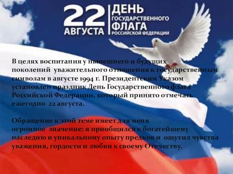 государственным символам в августе 1994 г. Президентским Указом установлен праздник День Государственного флага Российской Федерации, который принято отмечать ежегодно 22 августа.