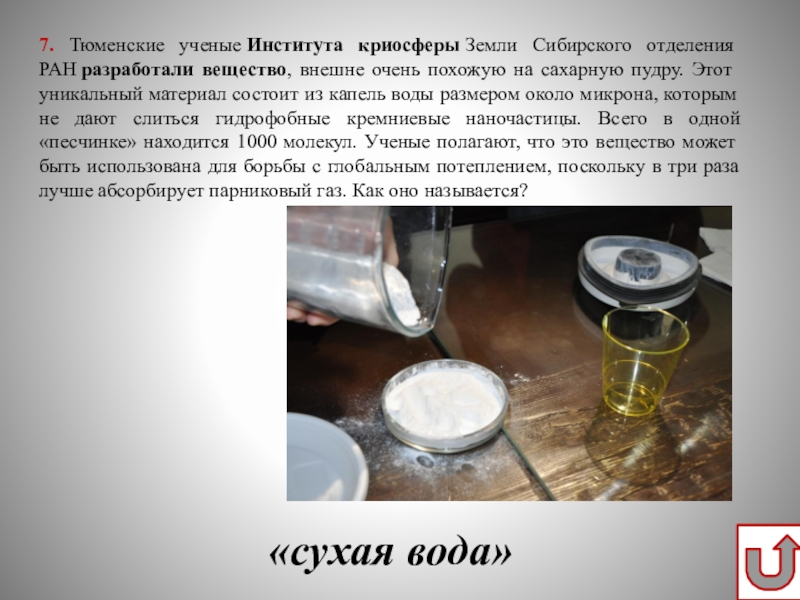 на сахарную пудру. Этот уникальный материал состоит из капель воды размером около микрона, которым не дают слиться гидрофобные кремниевые наночастицы. Всего в одной «песчинке» находится 1000 молекул. Ученые полагают, что это вещество может быть использована для борьбы с глобальным потеплением, поскольку в три раза лучше абсорбирует парниковый газ. Как оно называется?