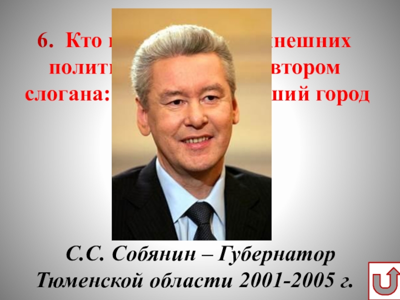 Слайд 96. Кто из успешных нынешних политиков является автором слогана: «Тюмень –