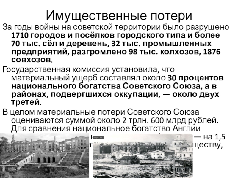 Государственная комиссия установила, что материальный ущерб составлял около 30 процентов национального богатства Советского Союза, а в районах, подвергшихся оккупации, — около двух третей.