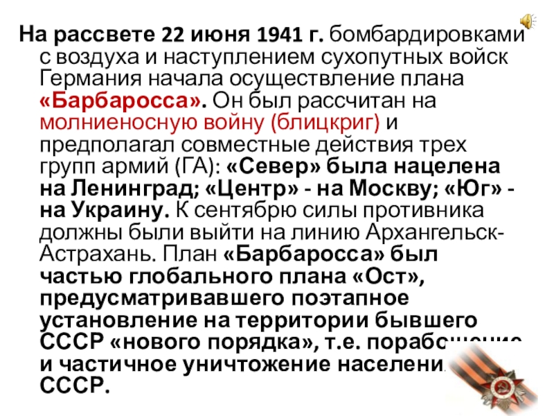 сухопутных войск Германия начала осуществление плана «Барбаросса». Он был рассчитан на молниеносную войну (блицкриг) и предполагал совместные действия трех групп армий (ГА): «Север» была нацелена на Ленинград; «Центр» - на Москву; «Юг» - на Украину. К сентябрю силы противника должны были выйти на линию Архангельск-Астрахань. План «Барбаросса» был частью глобального плана «Ост», предусматривавшего поэтапное установление на территории бывшего СССР «нового порядка», т.е. порабощение и частичное уничтожение населения СССР.