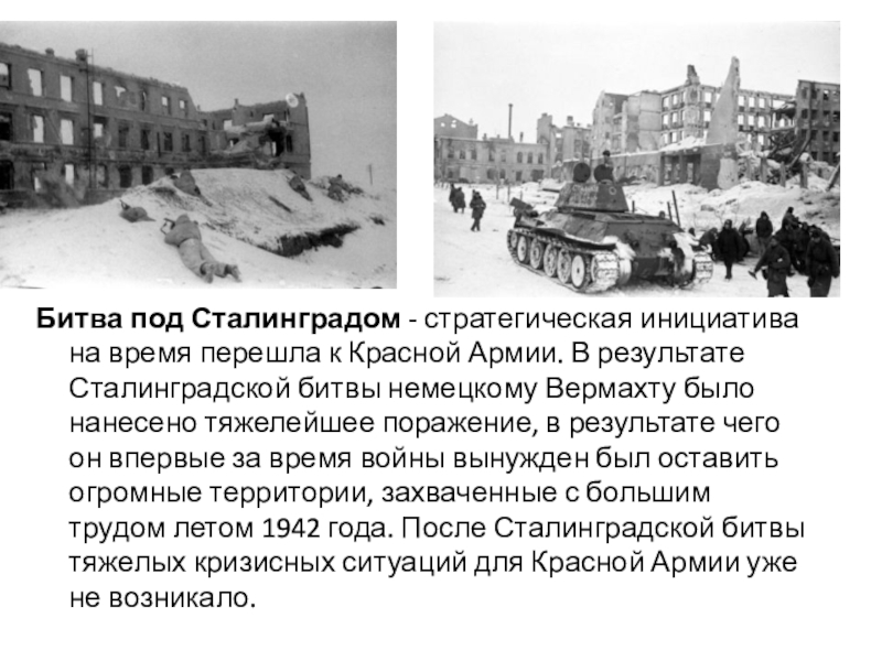 Армии. В результате Сталинградской битвы немецкому Вермахту было нанесено тяжелейшее поражение, в результате чего он впервые за время войны вынужден был оставить огромные территории, захваченные с большим трудом летом 1942 года. После Сталинградской битвы тяжелых кризисных ситуаций для Красной Армии уже не возникало.