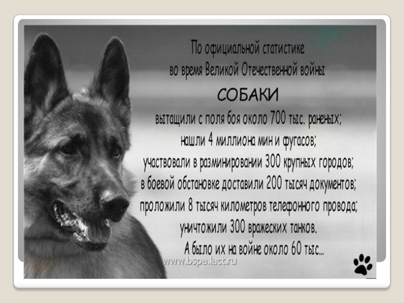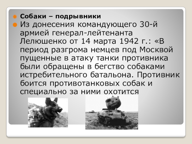марта 1942 г.: «В период разгрома немцев под Москвой пущенные в атаку танки противника были обращены в бегство собаками истребительного батальона. Противник боится противотанковых собак и специально за ними охотится