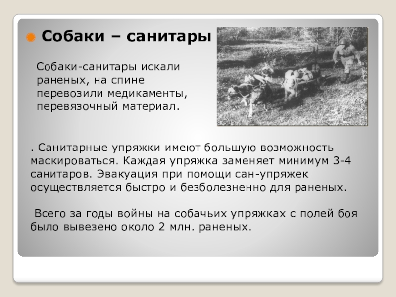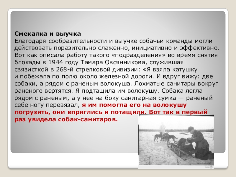 и эффективно. Вот как описала работу такого «подразделения» во время снятия блокады в 1944 году Тамара Овсянникова, служившая связисткой в 268-й стрелковой дивизии: «Я взяла катушку и побежала по полю около железной дороги. И вдруг вижу: две собаки, а рядом с раненым волокуша. Лохматые санитары вокруг раненого вертятся. Я подтащила им волокушу. Собака легла рядом с раненым, а у нее на боку санитарная сумка — раненый себе ногу перевязал, я им помогла его на волокушу погрузить, они впряглись и потащили. Вот так в первый раз увидела собак-санитаров.