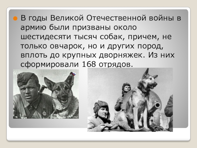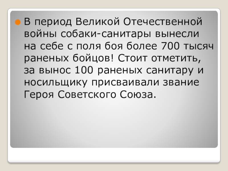 Слайд 19В период Великой Отечественной войны собаки-санитары вынесли на себе с поля