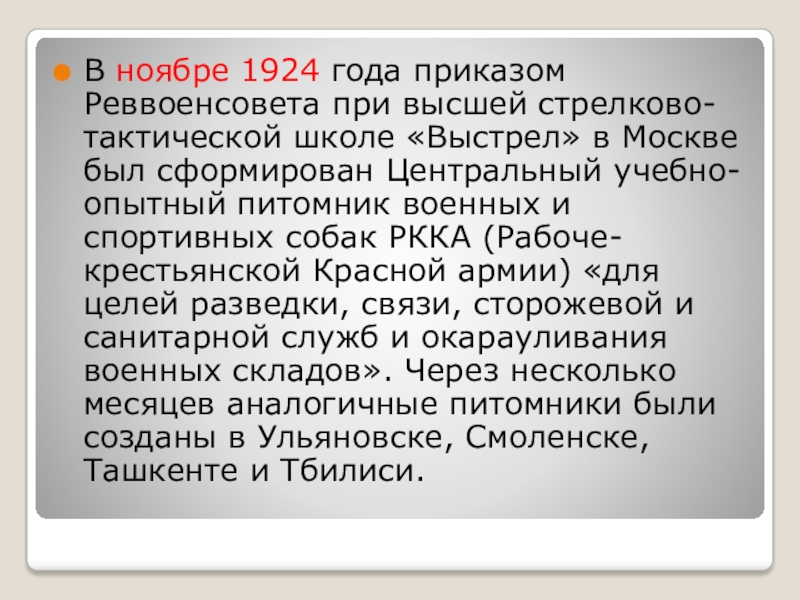 в Москве был сформирован Центральный учебно-опытный питомник военных и спортивных собак РККА (Рабоче-крестьянской Красной армии) «для целей разведки, связи, сторожевой и санитарной служб и окарауливания военных складов». Через несколько месяцев аналогичные питомники были созданы в Ульяновске, Смоленске, Ташкенте и Тбилиси.