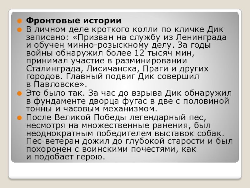 и обучен минно-розыскному делу. За годы войны обнаружил более 12 тысяч мин, принимал участие в разминировании Сталинграда, Лисичанска, Праги и других городов. Главный подвиг Дик совершил в Павловске».