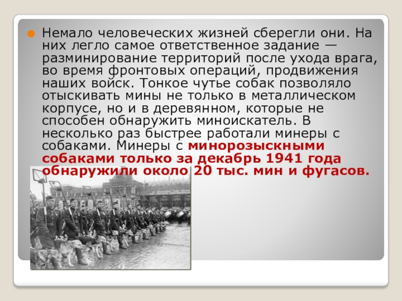 — разминирование территорий после ухода врага, во время фронтовых операций, продвижения наших войск. Тонкое чутье собак позволяло отыскивать мины не только в металлическом корпусе, но и в деревянном, которые не способен обнаружить миноискатель. В несколько раз быстрее работали минеры с собаками. Минеры с минорозыскными собаками только за декабрь 1941 года обнаружили около 20 тыс. мин и фугасов.
