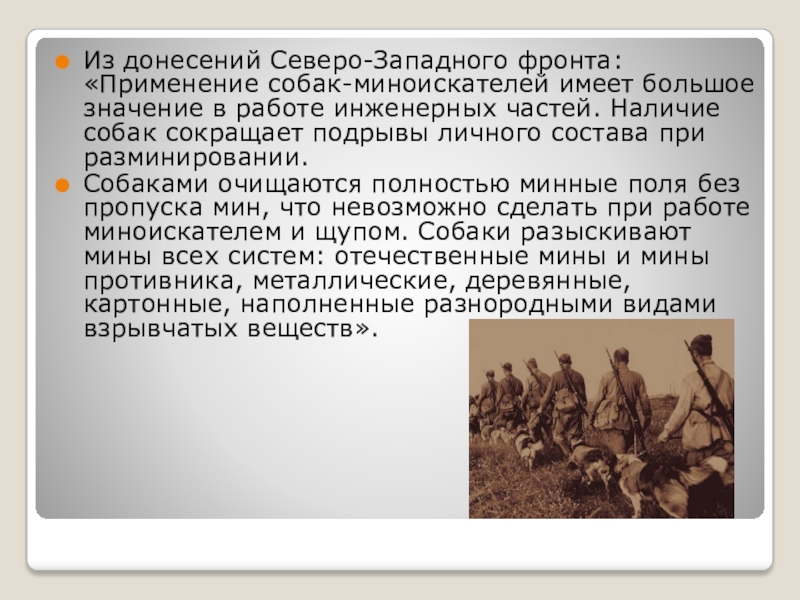 Собаками очищаются полностью минные поля без пропуска мин, что невозможно сделать при работе миноискателем и щупом. Собаки разыскивают мины всех систем: отечественные мины и мины противника, металлические, деревянные, картонные, наполненные разнородными видами взрывчатых веществ».