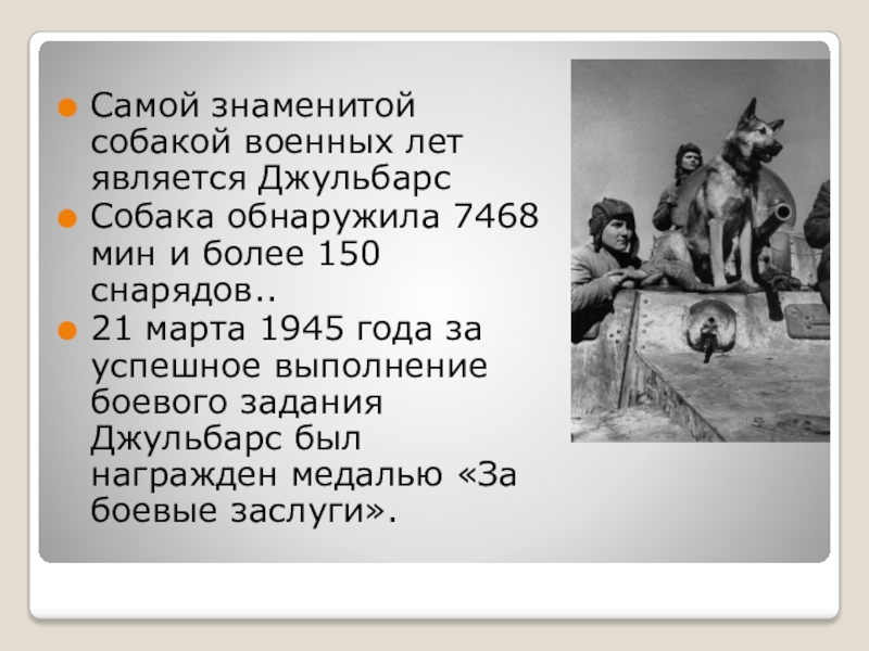 Слайд 15Самой знаменитой собакой военных лет является Джульбарс