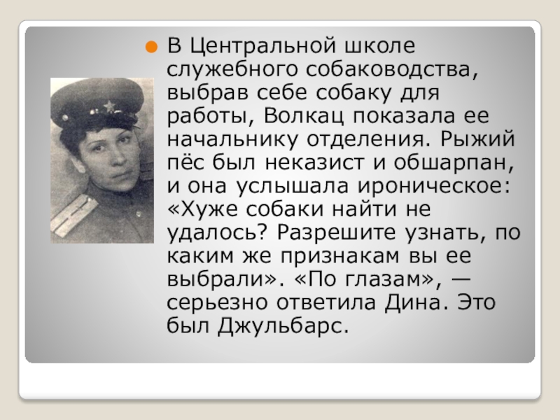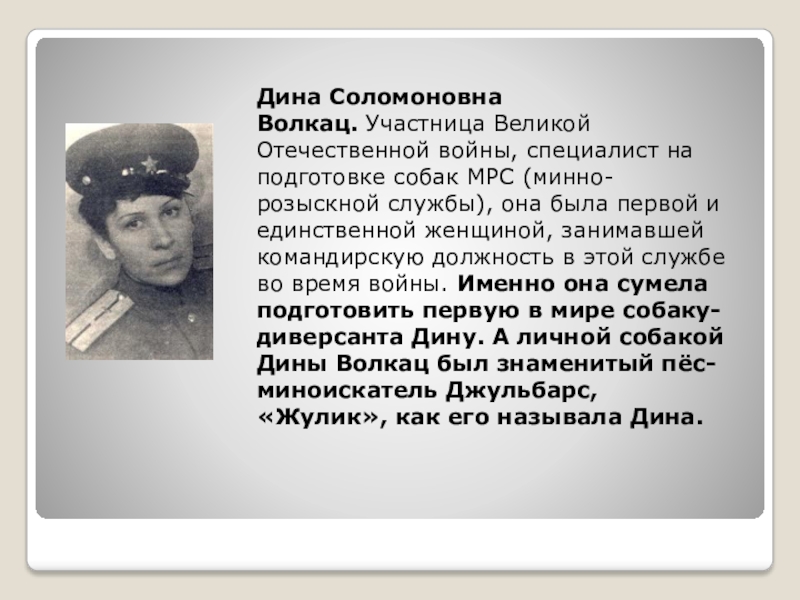 (минно-розыскной службы), она была первой и единственной женщиной, занимавшей командирскую должность в этой службе во время войны. Именно она сумела подготовить первую в мире собаку-диверсанта Дину. А личной собакой Дины Волкац был знаменитый пёс-миноискатель Джульбарс, «Жулик», как его называла Дина.