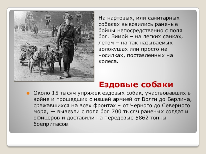Около 15 тысяч упряжек ездовых собак, участвовавших в войне и прошедших с нашей армией от Волги до Берлина, сражавшихся на всех фронтах – от Черного до Северного моря, — вывезли с поля боя 700 тысяч раненых солдат и офицеров и доставили на передовые 5862 тонны боеприпасов.