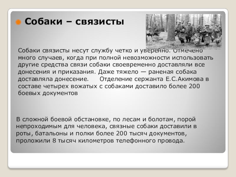 случаев, когда при полной невозможности использовать другие средства связи собаки своевременно доставляли все донесения и приказания. Даже тяжело — раненая собака доставляла донесение. Отделение сержанта Е.С.Акимова в составе четырех вожатых с собаками доставило более 200 боевых документов