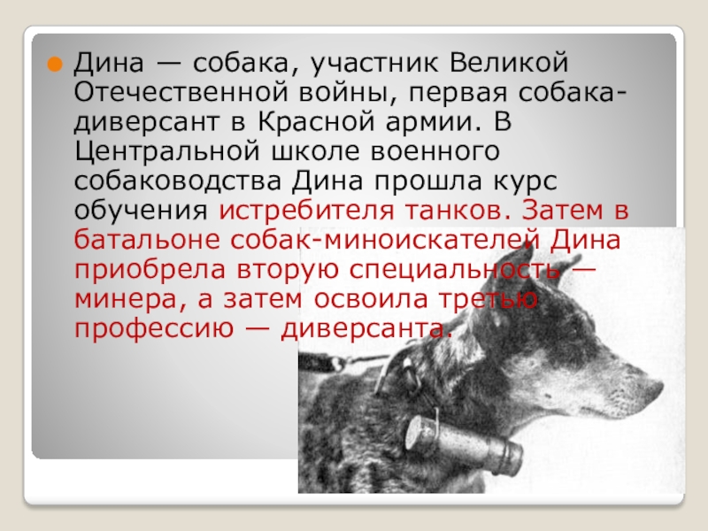 Слайд 10Дина — собака, участник Великой Отечественной войны, первая собака-диверсант в Красной