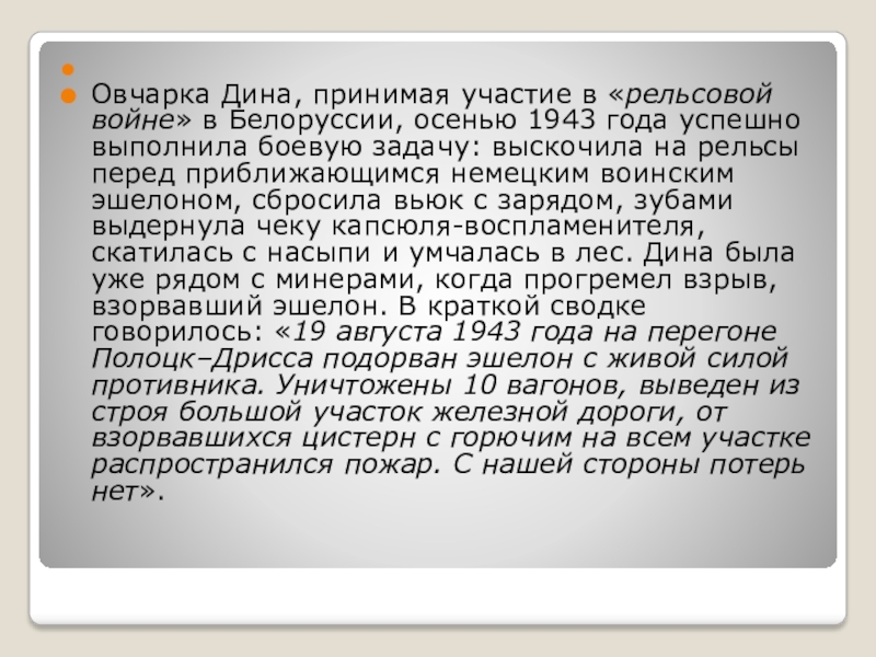 года успешно выполнила боевую задачу: выскочила на рельсы перед приближающимся немецким воинским эшелоном, сбросила вьюк с зарядом, зубами выдернула чеку капсюля-воспламенителя, скатилась с насыпи и умчалась в лес. Дина была уже рядом с минерами, когда прогремел взрыв, взорвавший эшелон. В краткой сводке говорилось: «19 августа 1943 года на перегоне Полоцк–Дрисса подорван эшелон с живой силой противника. Уничтожены 10 вагонов, выведен из строя большой участок железной дороги, от взорвавшихся цистерн с горючим на всем участке распространился пожар. С нашей стороны потерь нет».