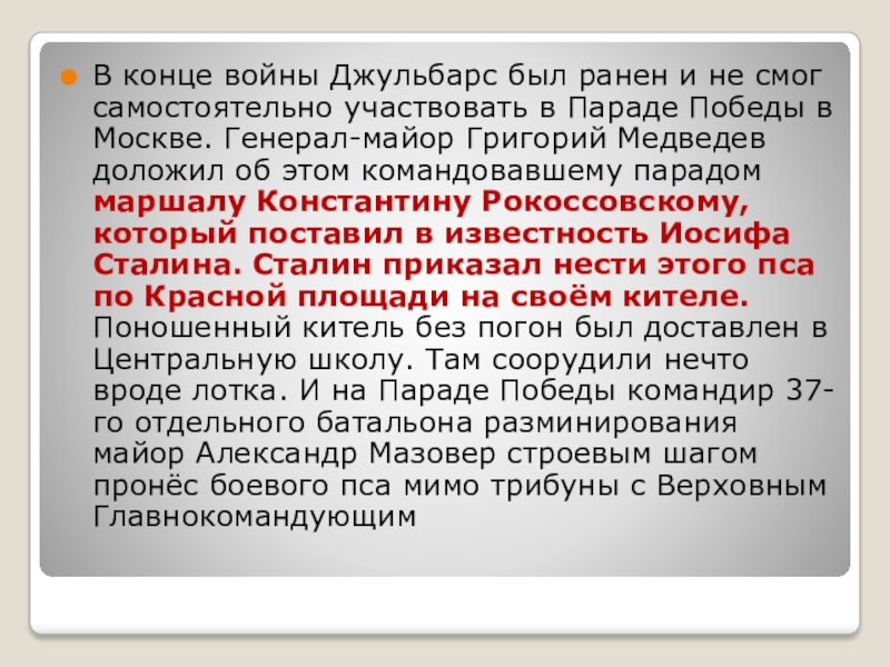 Слайд 17В конце войны Джульбарс был ранен и не смог самостоятельно участвовать