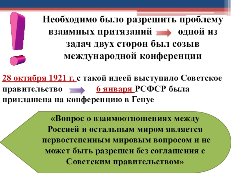 28 октября 1921 г. с такой идеей выступило Советское правительство 6 января РСФСР была приглашена на конференцию в Генуе