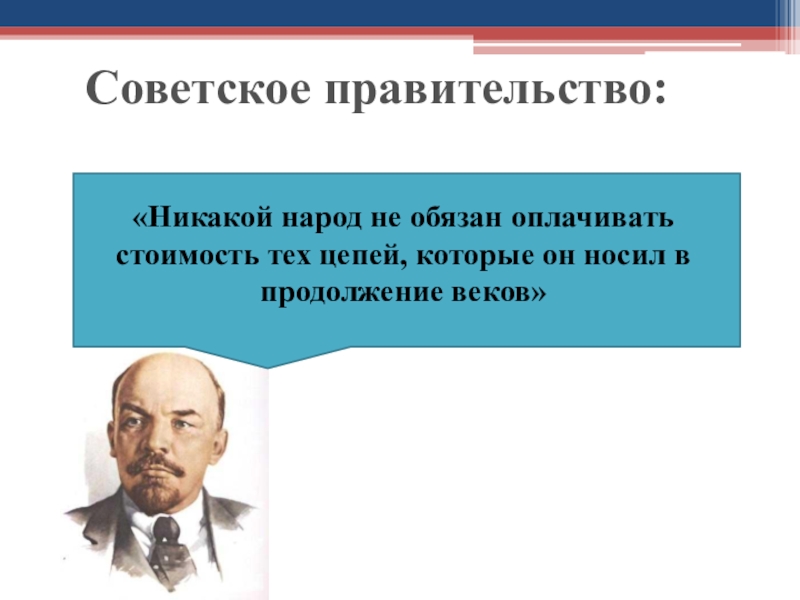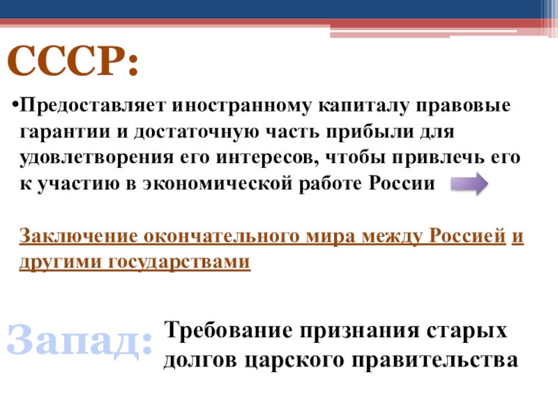 Для западных держав первостепенной была проблема возвращения долгов прежнего правительства России и судьба национализированной большевиками собственности иностранных граждан