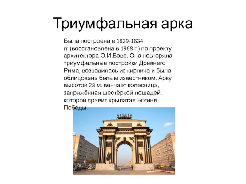 архитектора О.И.Бове. Она повторяла триумфальные постройки Древнего Рима, возводилась из кирпича и была облицована белым известняком. Арку высотой 28 м. венчает колесница, запряжённая шестёркой лошадей, которой правит крылатая Богиня Победы.