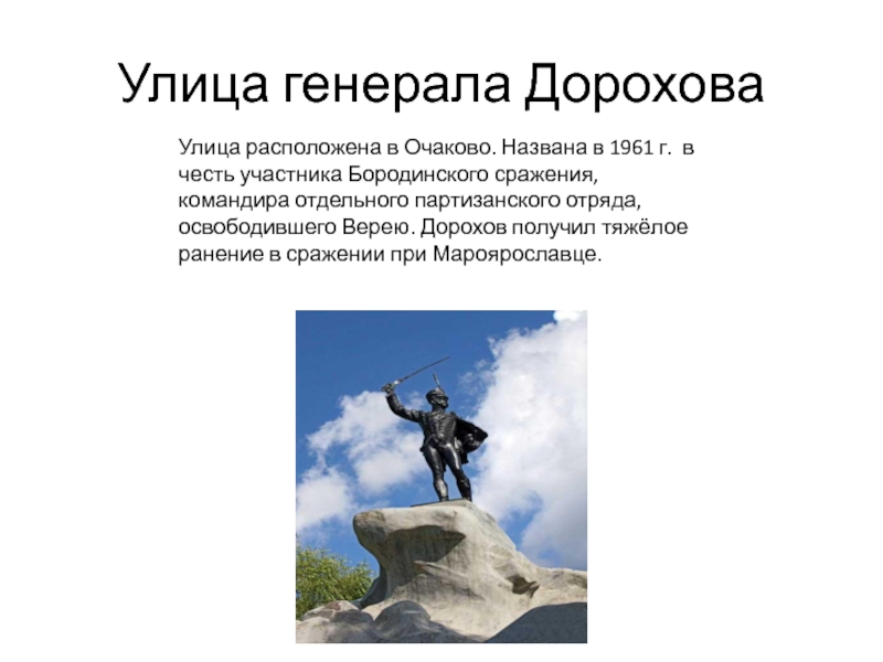 честь участника Бородинского сражения, командира отдельного партизанского отряда, освободившего Верею. Дорохов получил тяжёлое ранение в сражении при Мароярославце.