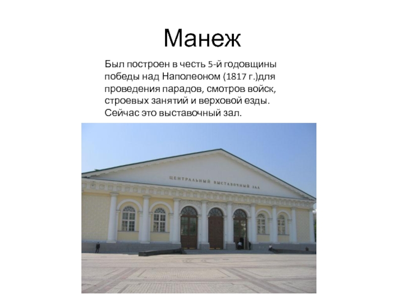 проведения парадов, смотров войск, строевых занятий и верховой езды. Сейчас это выставочный зал.