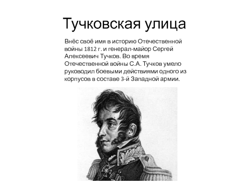 генерал-майор Сергей Алексеевич Тучков. Во время Отечественной войны С.А. Тучков умело руководил боевыми действиями одного из корпусов в составе 3-й Западной армии.