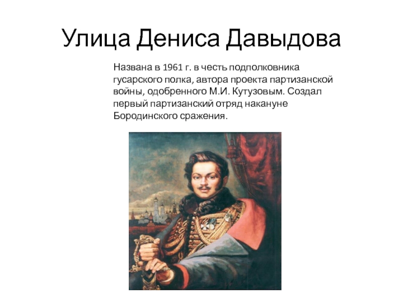 автора проекта партизанской войны, одобренного М.И. Кутузовым. Создал первый партизанский отряд накануне Бородинского сражения.