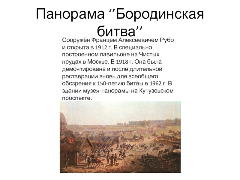 В специально построенном павильоне на Чистых прудах в Москве. В 1918 г. Она была демонтирована и после длительной реставрации вновь для всеобщего обозрения к 150-летию битвы в 1962 г. В здании музея-панорамы на Кутузовском проспекте.