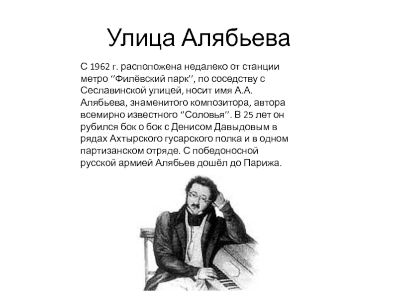 по соседству с Сеславинской улицей, носит имя А.А.Алябьева, знаменитого композитора, автора всемирно известного ‘’Соловья’’. В 25 лет он рубился бок о бок с Денисом Давыдовым в рядах Ахтырского гусарского полка и в одном партизанском отряде. С победоносной русской армией Алябьев дошёл до Парижа.