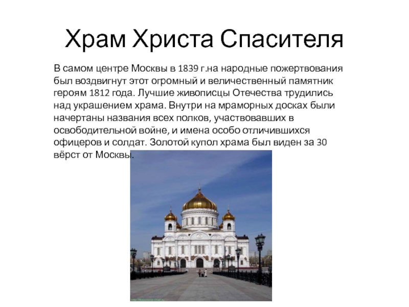 был воздвигнут этот огромный и величественный памятник героям 1812 года. Лучшие живописцы Отечества трудились над украшением храма. Внутри на мраморных досках были начертаны названия всех полков, участвовавших в освободительной войне, и имена особо отличившихся офицеров и солдат. Золотой купол храма был виден за 30 вёрст от Москвы.