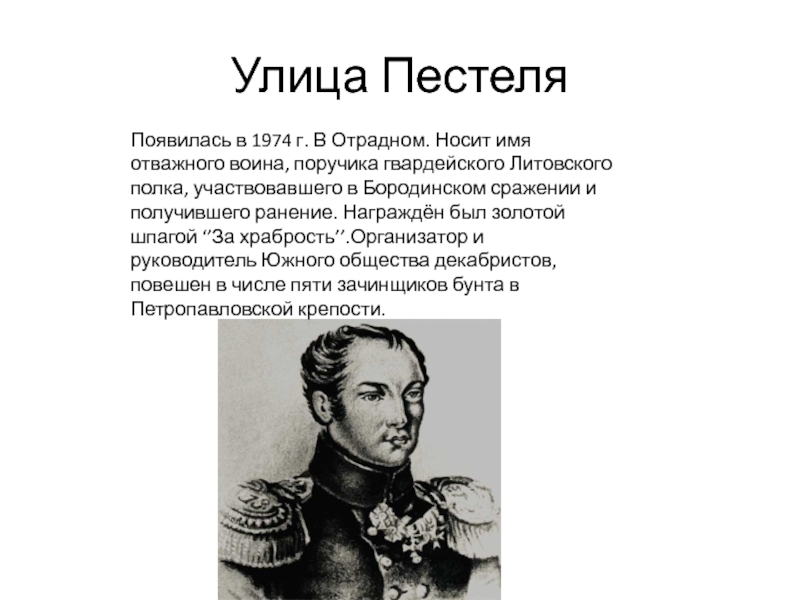 поручика гвардейского Литовского полка, участвовавшего в Бородинском сражении и получившего ранение. Награждён был золотой шпагой ‘’За храбрость’’.Организатор и руководитель Южного общества декабристов, повешен в числе пяти зачинщиков бунта в Петропавловской крепости.