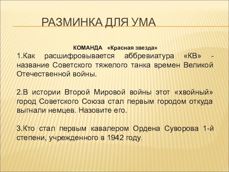 1.Как расшифровывается аббревиатура «КВ» - название Советского тяжелого танка времен Великой Отечественной войны.