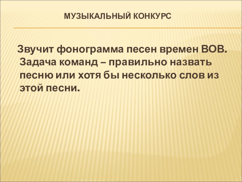 Звучит фонограмма песен времен ВОВ. Задача команд – правильно назвать песню или хотя бы несколько слов из этой песни.