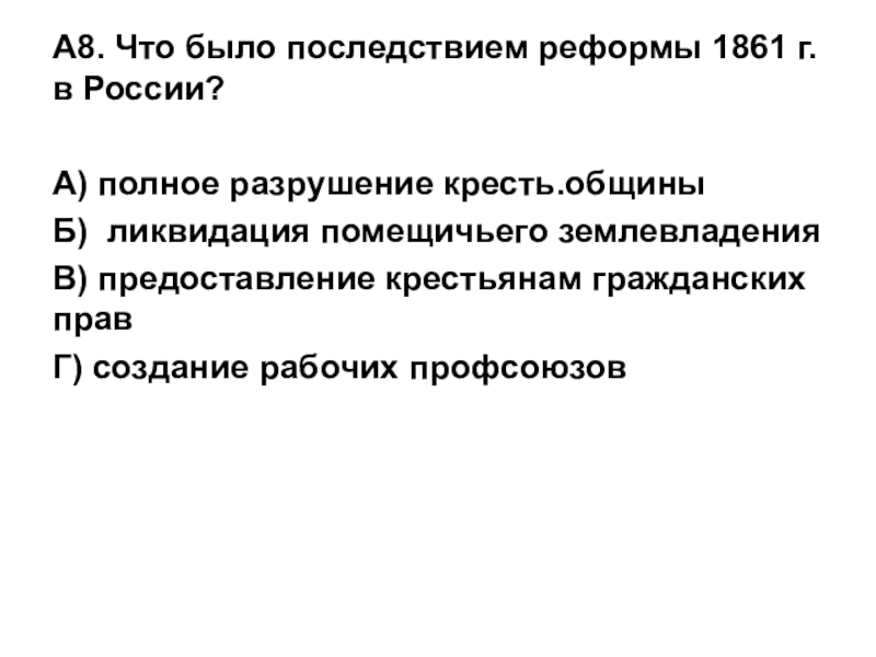 А8. Что было последствием реформы 1861 г. в России?А) полное разрушение кресть.общиныБ) ликвидация помещичьего землевладенияВ) предоставление крестьянам