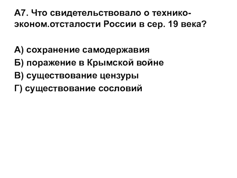 Слайд 8А7. Что свидетельствовало о технико-эконом.отсталости России в сер. 19 века?