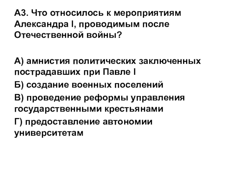 Слайд 4А3. Что относилось к мероприятиям Александра I, проводимым после Отечественной войны?