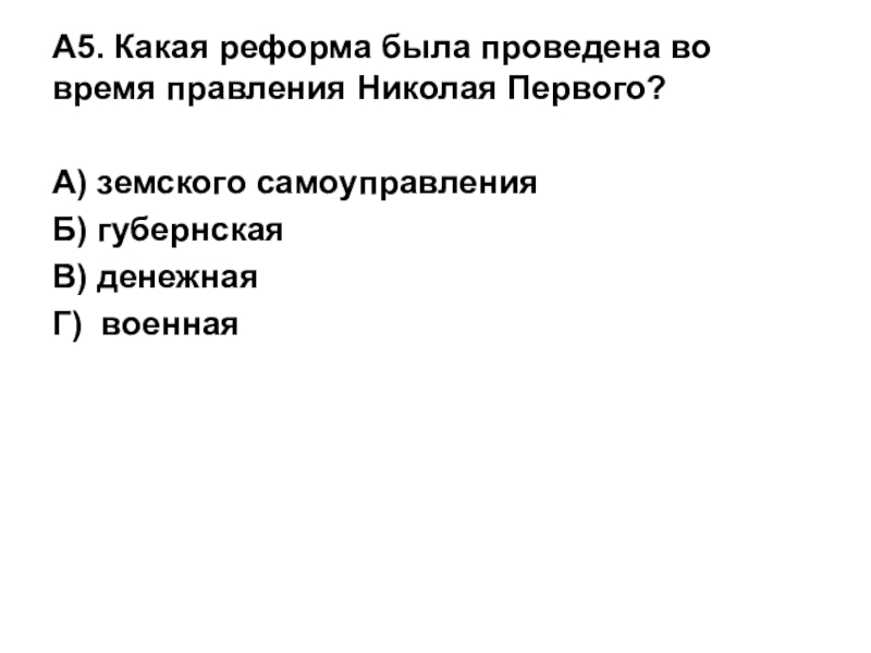 А5. Какая реформа была проведена во время правления Николая Первого?А) земского самоуправленияБ) губернскаяВ) денежнаяГ) военная