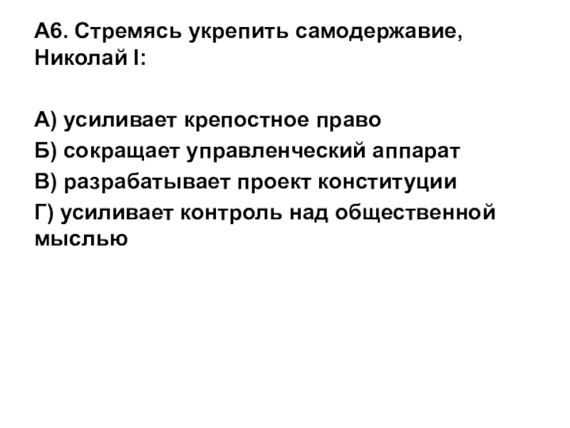 А6. Стремясь укрепить самодержавие, Николай I: А) усиливает крепостное правоБ) сокращает управленческий аппаратВ) разрабатывает проект конституцииГ) усиливает