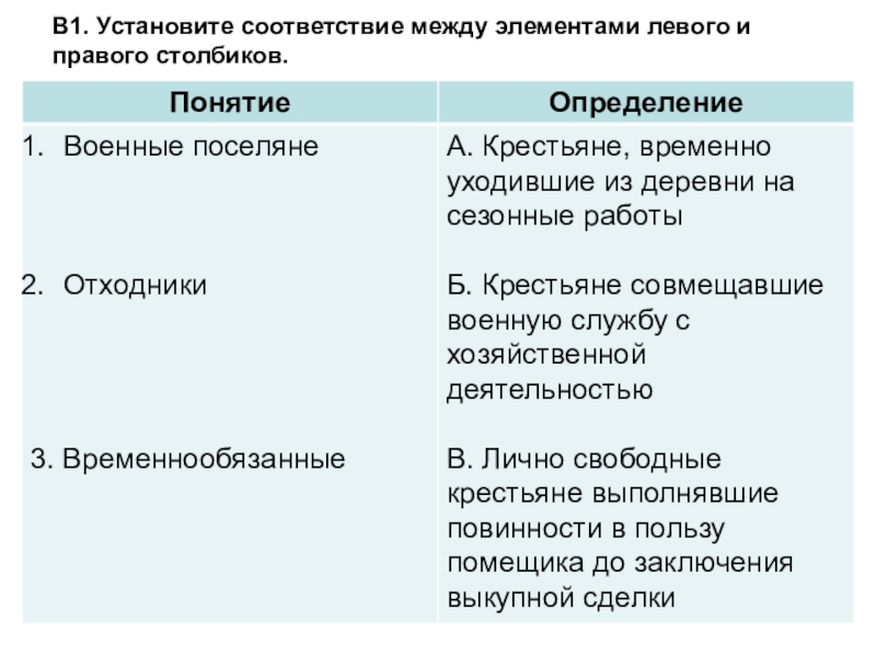 Слайд 13В1. Установите соответствие между элементами левого и правого столбиков.