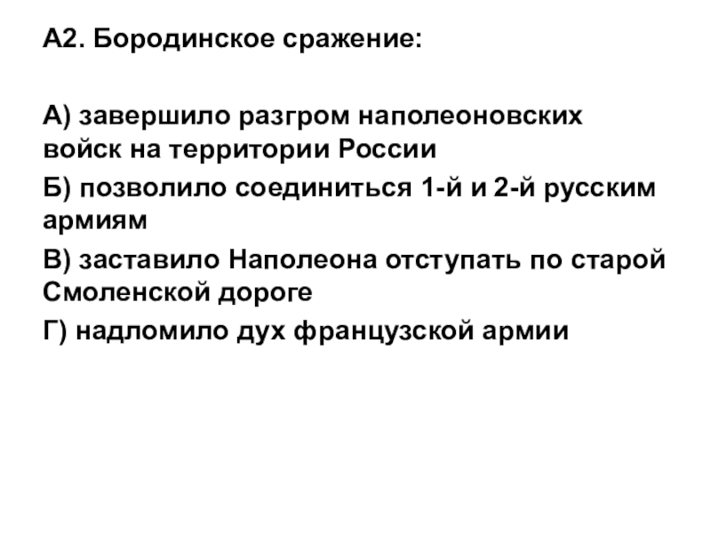 А2. Бородинское сражение:А) завершило разгром наполеоновских войск на территории РоссииБ) позволило соединиться 1-й и 2-й русским армиямВ)