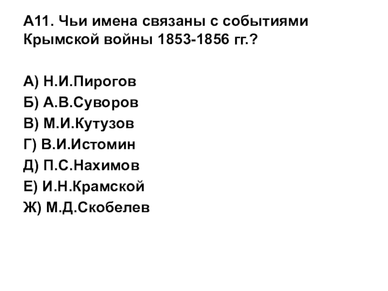 Слайд 12А11. Чьи имена связаны с событиями Крымской войны 1853-1856 гг.?