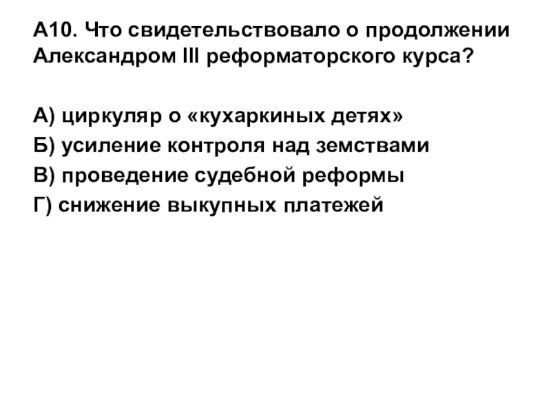 Слайд 11А10. Что свидетельствовало о продолжении Александром III реформаторского курса?