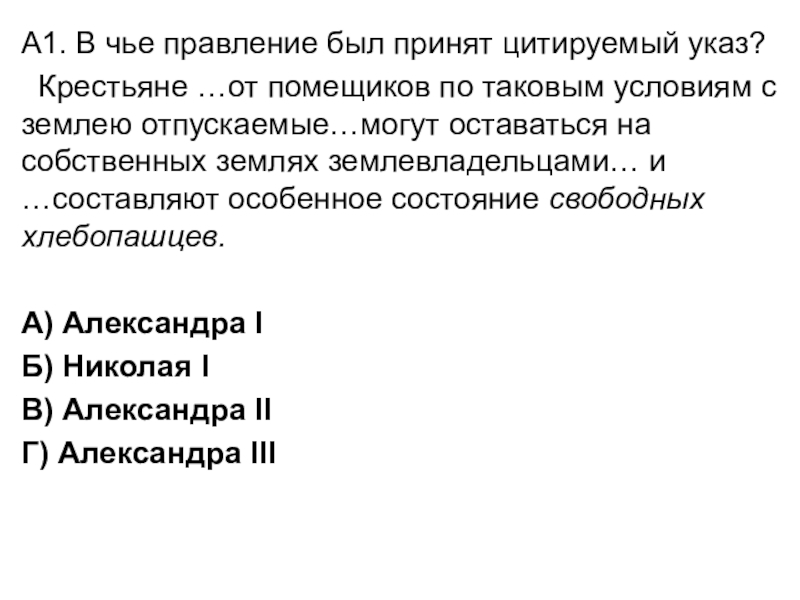 А1. В чье правление был принят цитируемый указ? Крестьяне …от помещиков по таковым условиям с землею отпускаемые…могут оставаться на собственных землях землевладельцами… и …составляют особенное состояние свободных хлебопашцев.А) Александра IБ) Николая IВ) Александра IIГ) Александра III
