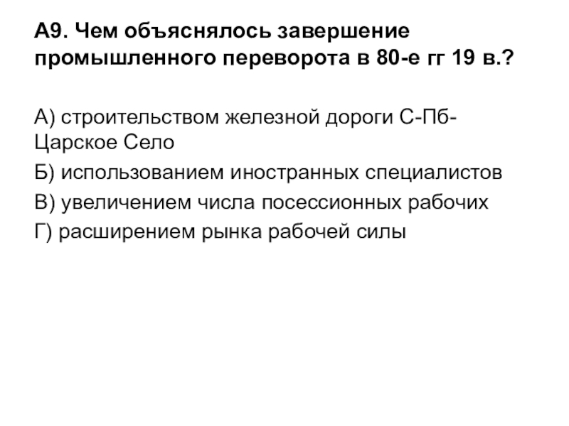 Слайд 10А9. Чем объяснялось завершение промышленного переворота в 80-е гг 19 в.?
