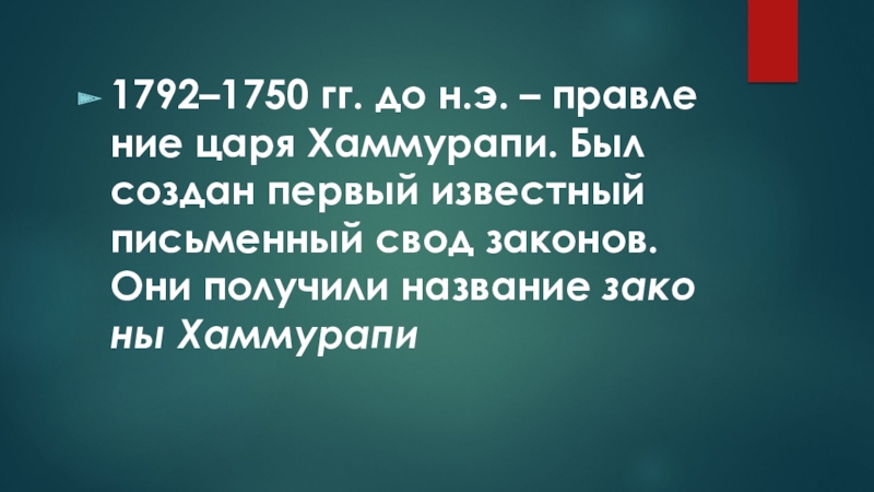 1792–1750 гг. до н.э. – прав­ле­ние царя Хам­му­ра­пи. Был со­здан пер­вый из­вест­ный пись­мен­ный свод за­ко­нов. Они по­лу­чи­ли на­зва­ние за­ко­ны Хам­му­ра­пи