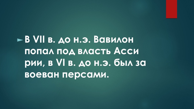 В VII в. до н.э. Ва­ви­лон попал под власть Ас­си­рии, в VI в. до н.э. был за­во­е­ван