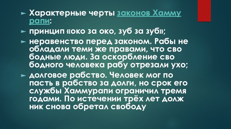 Ха­рак­тер­ные черты за­ко­нов Хам­му­ра­пи:прин­цип «око за око, зуб за зуб»;нера­вен­ство перед за­ко­ном. Рабы не об­ла­да­ли теми же