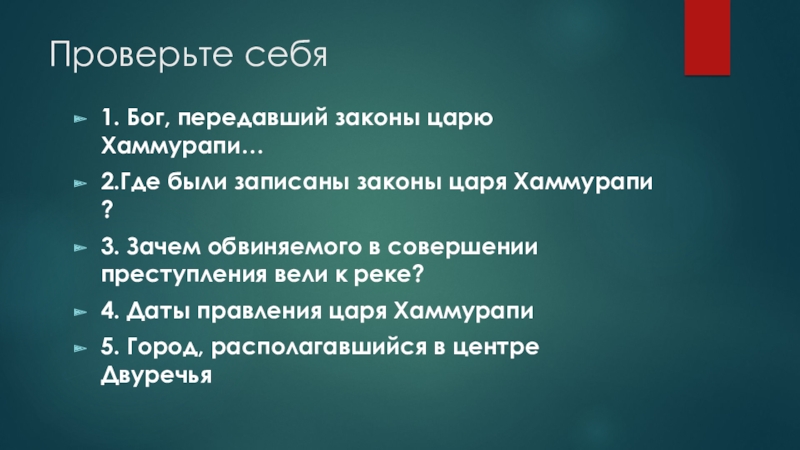 Проверьте себя 1. Бог, передавший законы царю Хаммурапи…2.Где были записаны законы царя Хаммурапи ?3. Зачем обвиняемого в