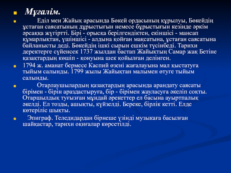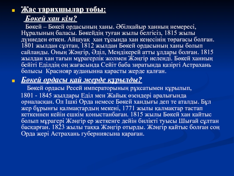 білімділік. Бөкей ордасының құрылуы, оның мұрагері Жәңгірдің кезіндегі халықтың жағдайы, Исатай мен Махамбет көтерілісінің шығуы және Жәңгір ханның өз заманында білімді - білікті тұлға екендігіне сипаттама беріп, талдау жасап зерттеу.