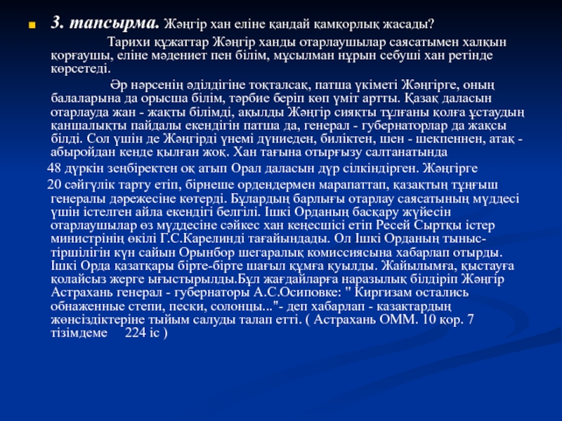3. тапсырма. Жәңгір хан еліне қандай қамқорлық жасады?